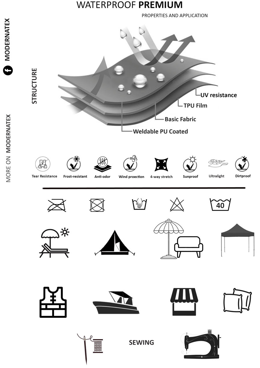 Tato látka je ideální pro venkovní použití, jako jsou zahradní nábytek, zahradní polštáře, malé markýzy, malé deštníky, strany stanů, altány, lehátka a houpačky.