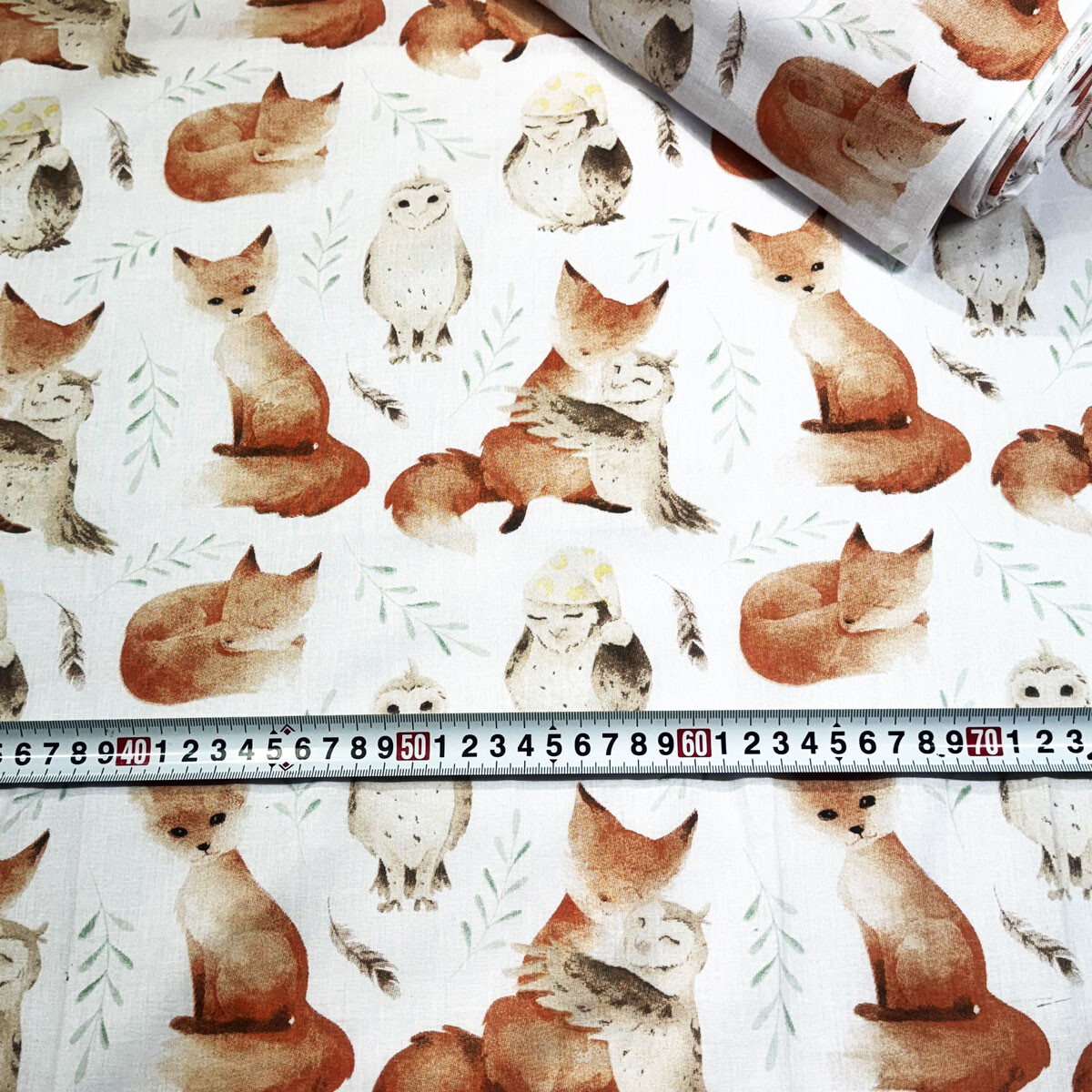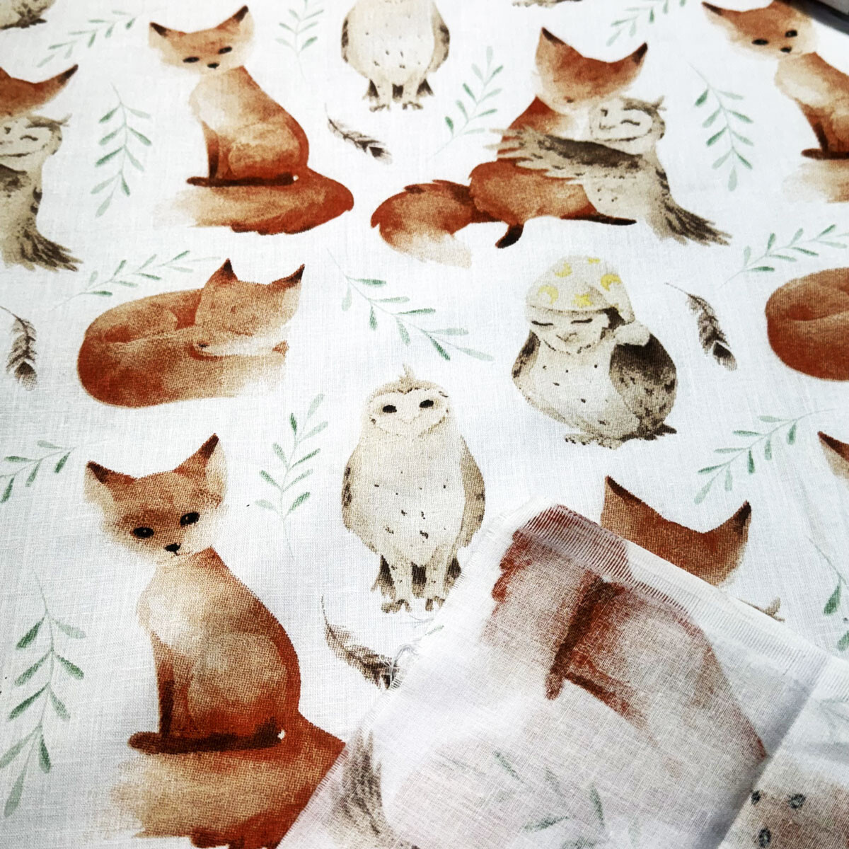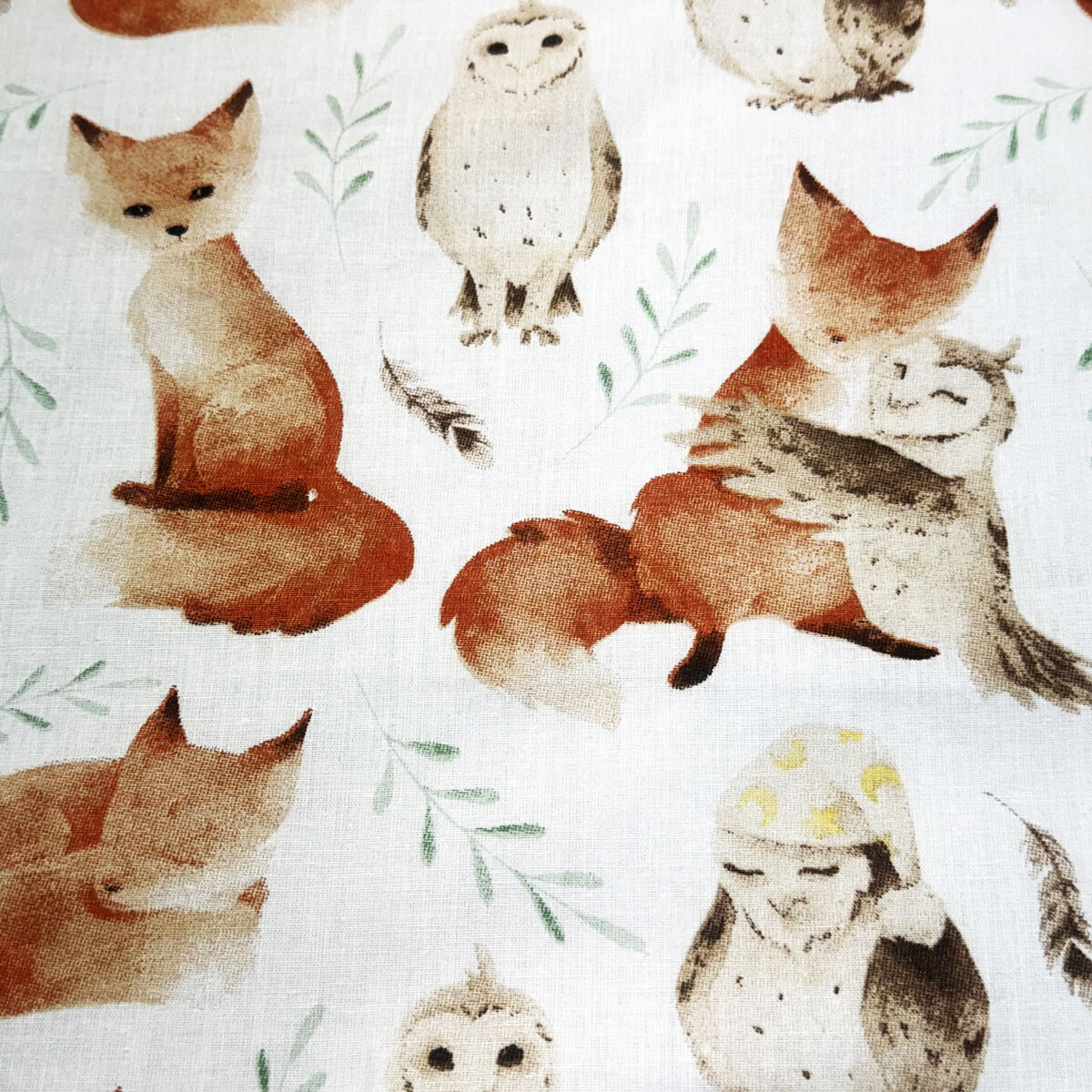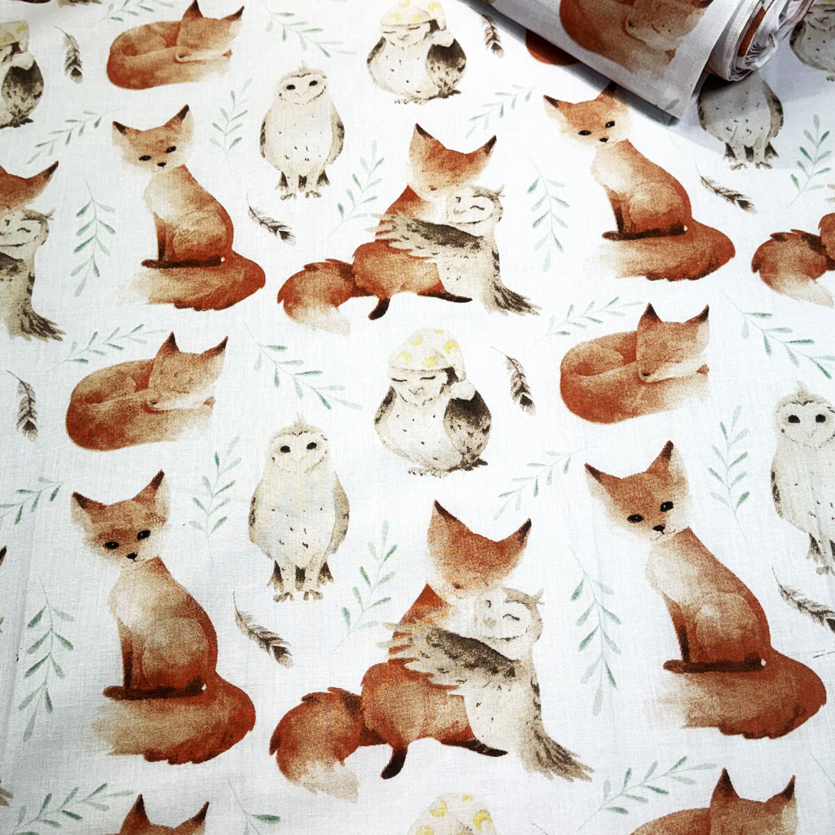Popis Bavlněné látky, metráž. Veverka a Sova na Bílém