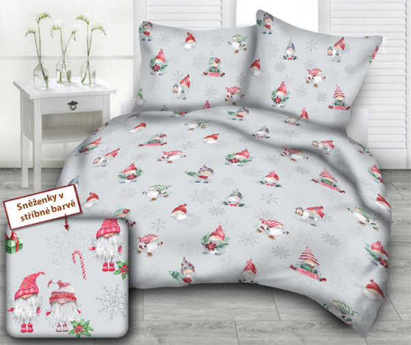 Popis Vánoční bavlněná látka, metráž, šíře 160 cm, Skřítci Červené a Zelené na Šedém, Šedé vločky